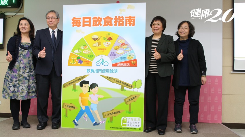 ▲國健署長王英偉(左二)與營養師們共同發表最新每日飲食指南。