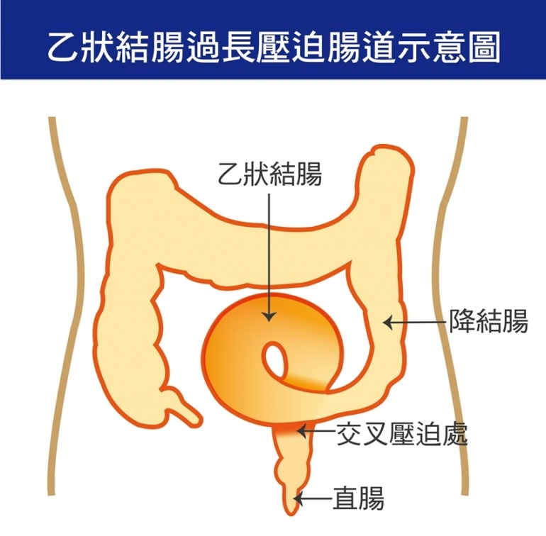 正常的大腸系統呈現ㄇ字形,乙狀結腸位於降結腸和直腸之間,正常長度落在20到30公分之間,至於先天乙狀結腸過長的長度約在50至60公分之間。澄清醫院中港院區大腸直腸外科主治醫師馬秀峰說明,隨著年紀增長,可能因大腸蠕動減緩,導致過長的乙狀結腸扭結在一起,因而產生腹脹、腹痛、便祕等情形。