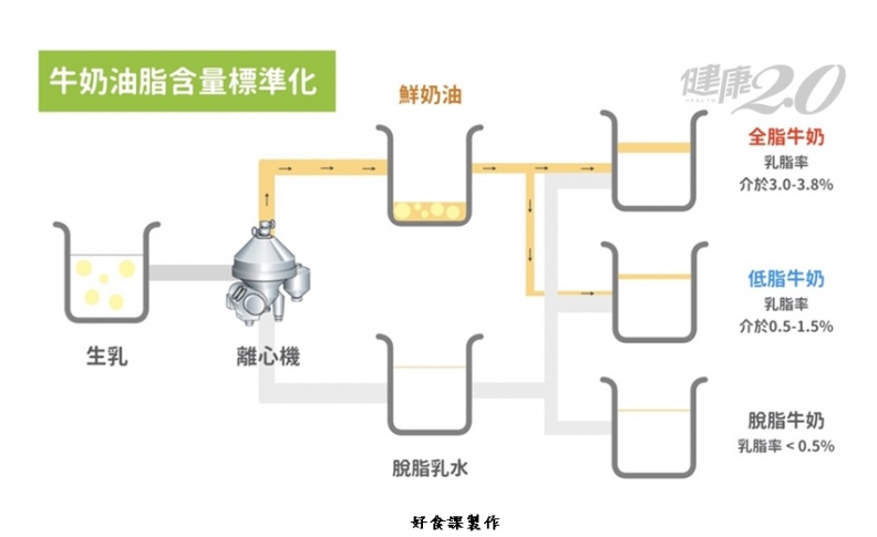 要比較低脂牛奶及全脂牛奶的健康差異,就要先來講講低脂牛奶的加工。牛奶從母牛擠出來後,理當是全脂的,但是不同季節、不同農場、不同飼料的飼養結果都會影響到牛奶的乳脂含量。