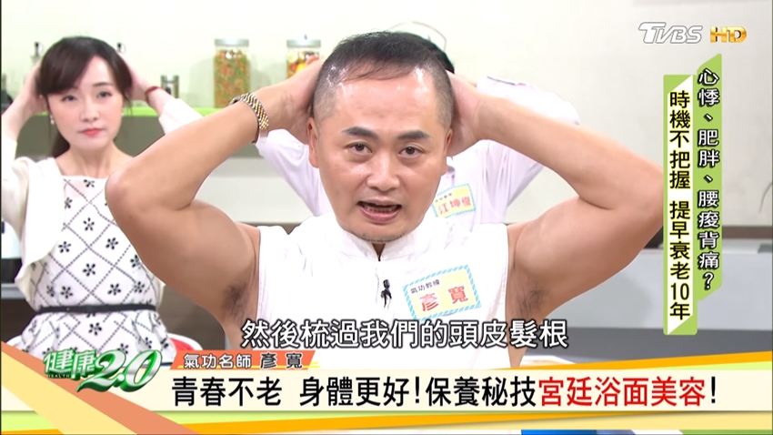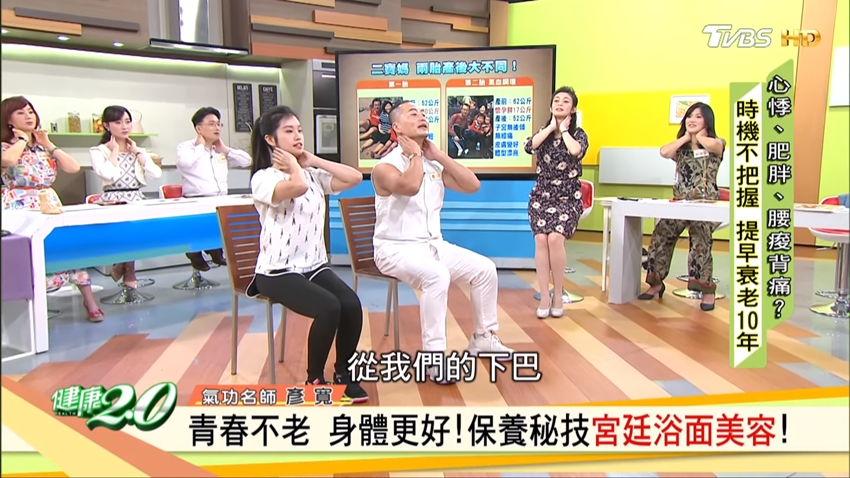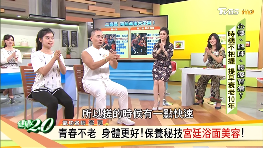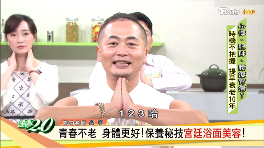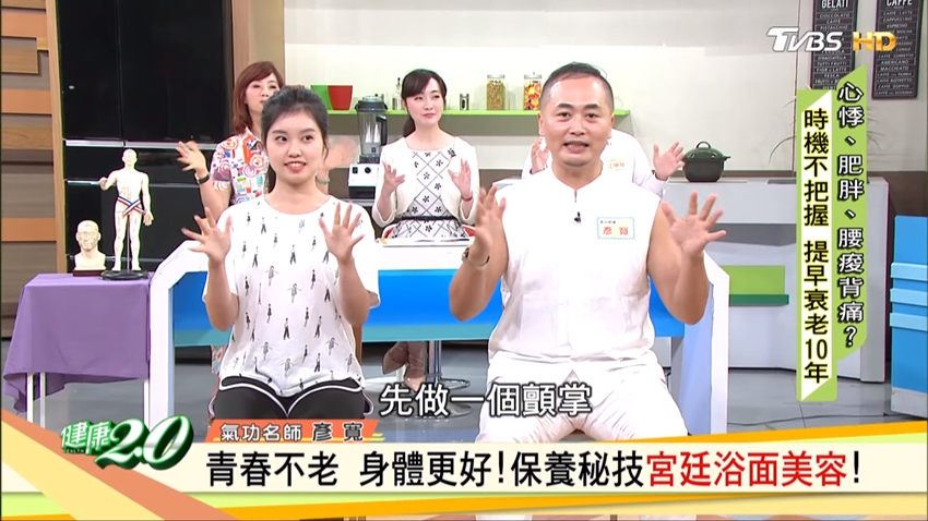 據說過去宮廷裡的妃子生產過後,為了維持美麗和青春的樣貌,藉以取悅皇上,都會練習這套「宮廷浴面美容」。彥寬老師特別建議夫妻一起做,尤其產後女性特別需要心靈上的支持;他在妻子白雁生產過後,也一起練了這套功法,到現在50幾歲了,皮膚仍然相當透亮有光澤,也有部分歸功於這套功法。