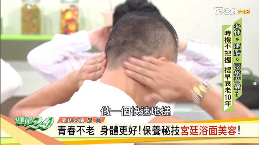 彥寬老師說明,後腦杓有中醫所說的風池穴、玉枕穴,而整個後腦勺在氣功裡稱為「玉枕關」,用雙手將它搓熱,有助於疏通氣血,幫助提振精神、外貌也更亮麗。