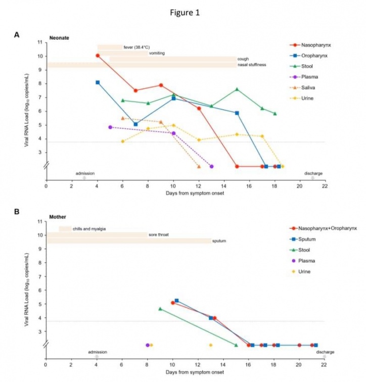 這名出生僅27天的女嬰是與母親一同確診新冠肺炎,該女嬰出現的症狀有發燒,咳嗽和嘔吐。根據研究指出,病毒載量從症狀發作的第10天開始,嬰兒的上呼吸道和糞便檢體比母親高出約100倍(見下圖)。
