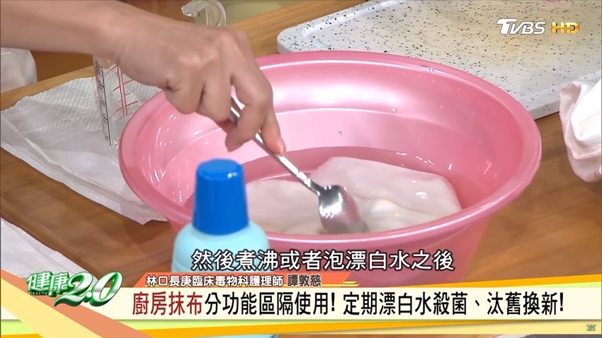 抹布用完之後,她會先用洗碗精清潔,再將抹布放入滾水煮5分鐘,有消毒殺菌的效果;如果抹布上已經有些許髒污或發霉,同樣要先用洗碗精洗乾淨,接著準備一盆加水稀釋的漂白水(1:1000),讓抹布充分浸泡一個晚上,烘乾或曬乾後再使用。