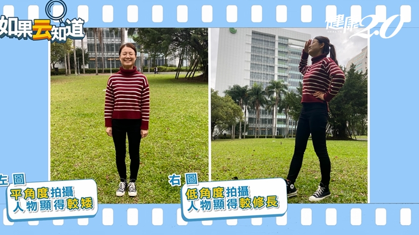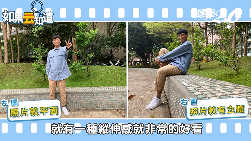 貝克大叔說,「腿要拍的長」要搭配兩件事,第一是構圖,第二是動作。拍照角度要偏低,越低越好。人物就要配合動作,站側邊一點點,並把腳延伸出去、腳尖點地。記得,人物要放在三分之一的位置,這樣子腿就會顯長了。