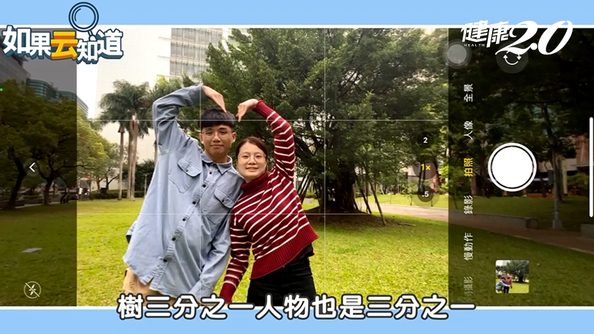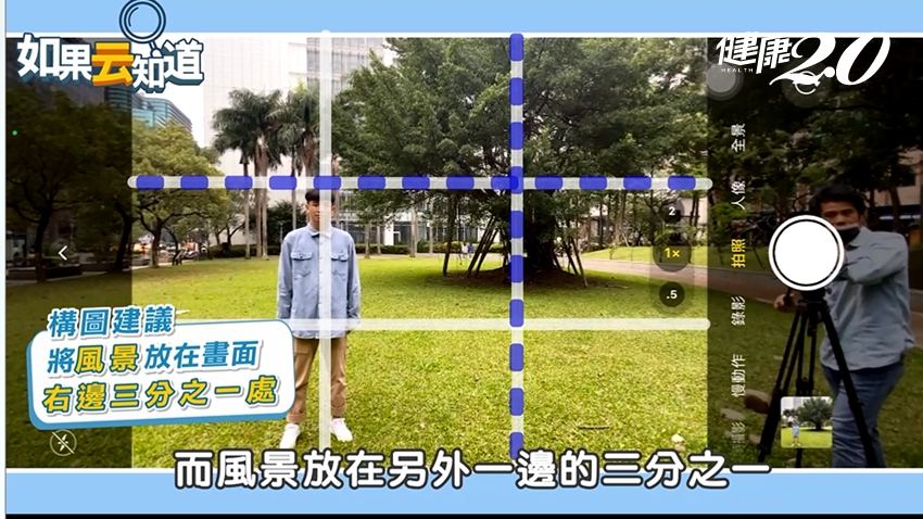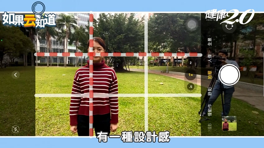 貝克大叔說,一般人在拍照的時候,一定會把人物置中,但每個人都這樣拍就沒有特色。在九宮格裡,可以把人物放到格線上面,這樣子就會形成設計感,就會比呆呆的站在中間,來得好很多。