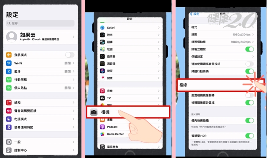 把九宮格叫出來的方法:打開手機,從「設定」中找到「相機」,再把「格線」打開就可以了。