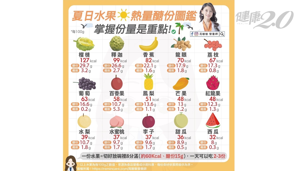 膳食纖維除了從蔬菜取得,水果也是必須來源,因為水果有獨特的植化素和營養素,不論是蔬菜或水果都不可少。李婉萍表示,高纖水果排名,以百香果居冠,100g的百香果就有5.3g纖維。其次依序為芭樂、釋迦、奇異果、柳丁、草莓、小番茄、香蕉、蜜棗、橘子、紅火龍果、蘋果、柿子、蓮霧、葡萄。