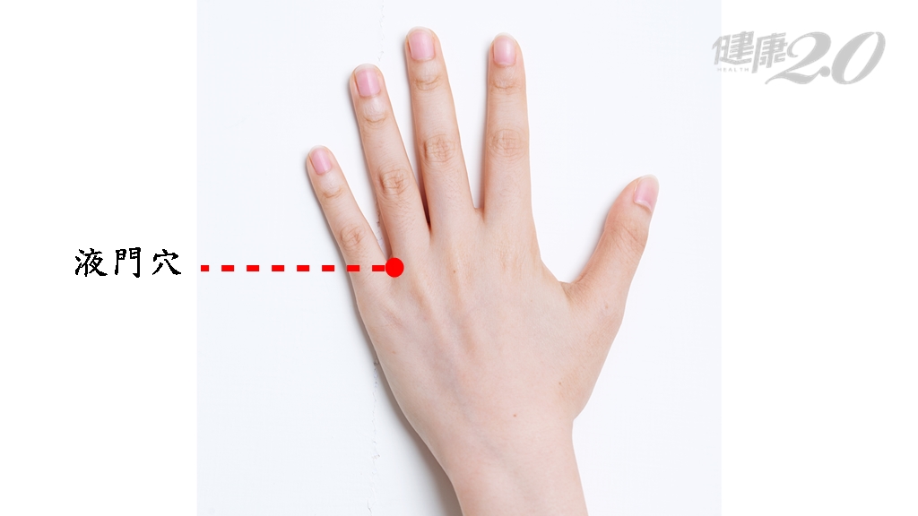 液門穴位於手背第4~5指間,兩筋中間凹陷處,屬於手少陽三焦經,可改善眼痛、頭痛、耳朵痛等五官疾病,建議利用大拇指分別按壓雙手的液門穴,一次15分鐘。