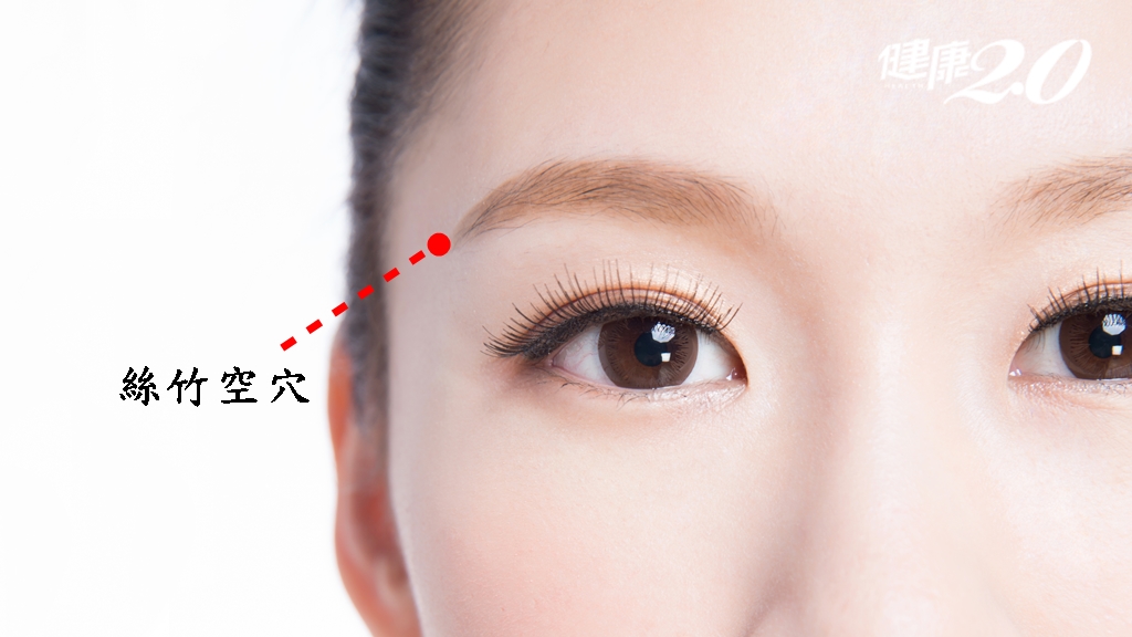 絲竹空穴位於眉毛後方凹陷處,屬於手少陽三焦經,可治療眼睛痛、眼皮跳動、眼睛紅赤等症狀,利用手指的食指及中指分別按壓兩側絲竹空穴,一次15分鐘。