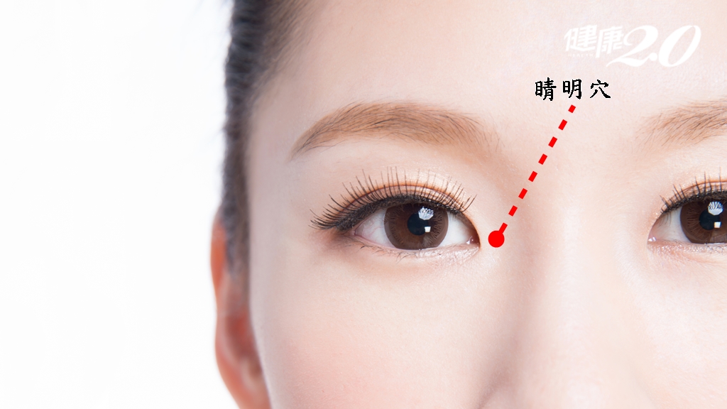 睛明穴位於上眼瞼眼眶內上方凹陷處,睛明為眼睛明亮之意,屬於足太陽膀胱經,按摩睛明穴可使眼睛放鬆、改善視力模糊,可以用食指、中指分別按壓兩側的睛明穴,一次15分鐘。