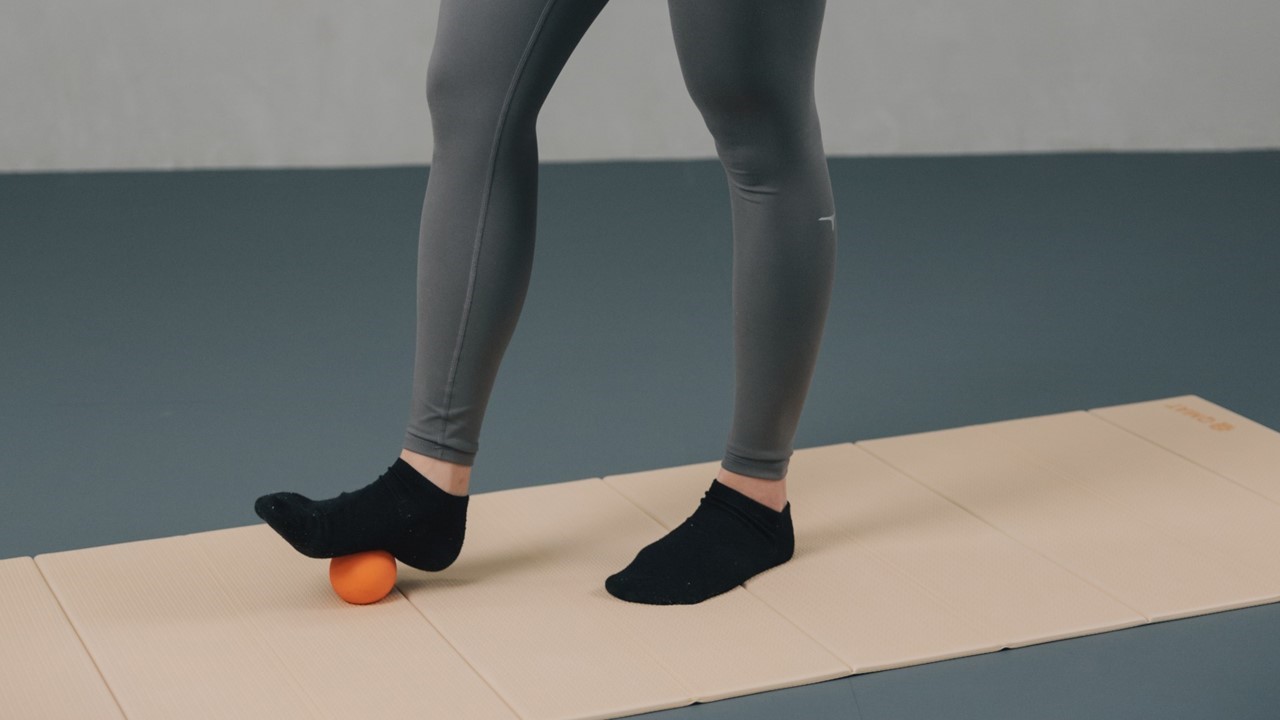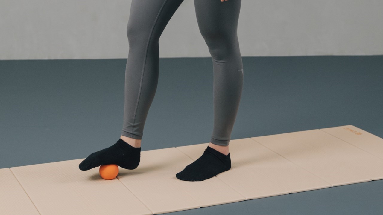 腳板來回勾放法:利用腳踩桌球、網球,將球從腳跟處往腳尖處來回滾動,達到放鬆足底筋膜效果。