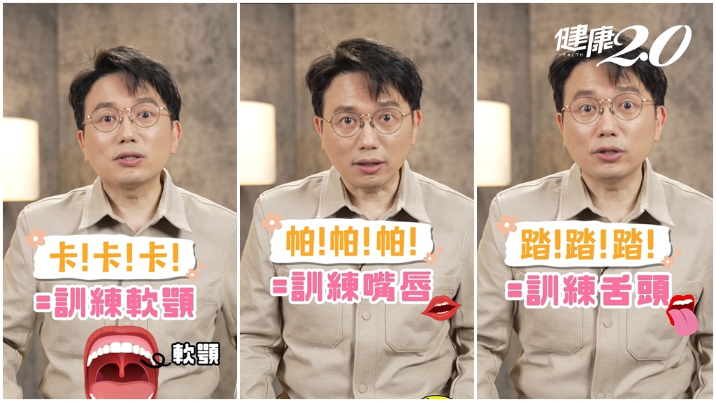 江P表示,當你發出帕、踏、卡的聲音時,嘴唇、舌頭都會被訓練,而且會振動到軟顎,最後的「啊」更是會訓練到喉嚨。他強調,這個動作沒有規定一天要做幾次,可以邊看電視就邊做,常常做這個發音練習,就可以有效訓練到臉部肌肉,有效預防失智症。