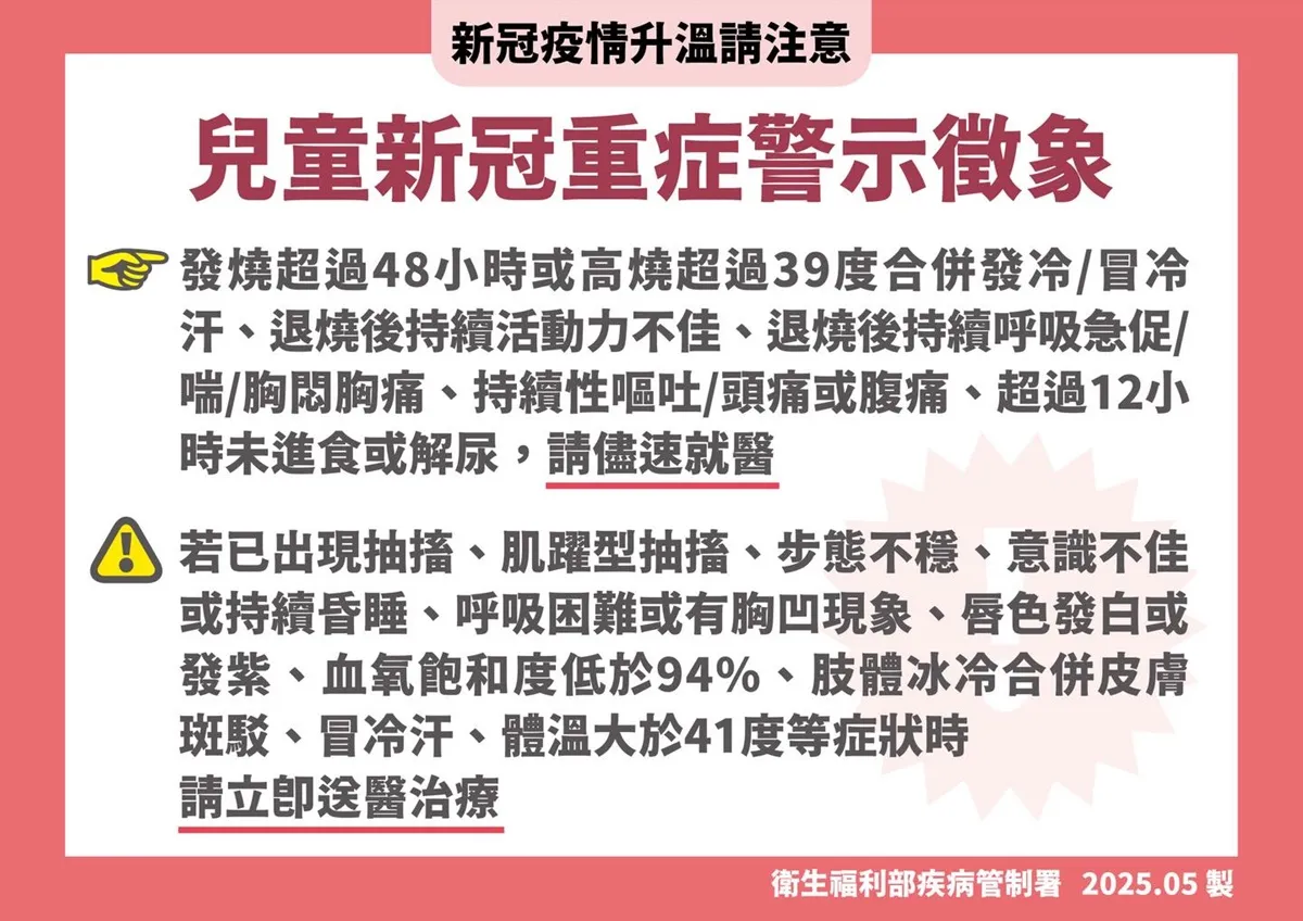 近期新冠重症發生多起年齡不足6個月的嬰兒,疾管署提醒,以下是兒童感染新冠的警示徵象: