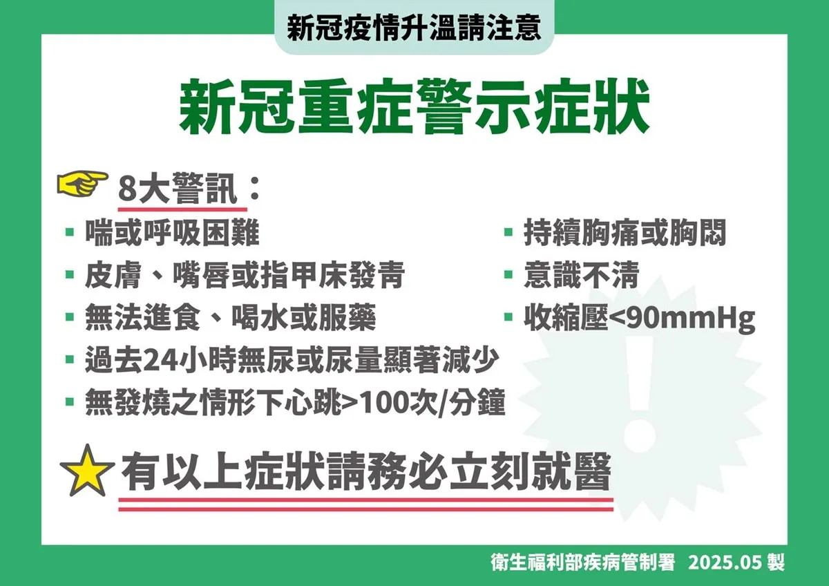 如出現下列重症警示症狀,包括喘或呼吸困難、持續胸痛或胸悶、意識不清、皮膚/嘴唇或指甲床發青、無法進食/喝水或服藥、過去24小時無尿或尿量顯著減少、收縮壓<90mmHg或無發燒之情形下心跳>100次/分鐘,請務必立刻就醫。