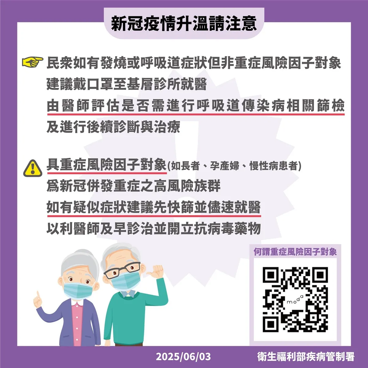 而因應疫情需求,決定放寬高風險對象打疫苗限制,自2025年6/11日,「65歲以上長者、55至64歲原住民、免疫不全者」等三類高風險對象,打第二劑新冠JN.1疫苗不必再等6個月,接種間隔調整為2個月(60天)就可以接種。