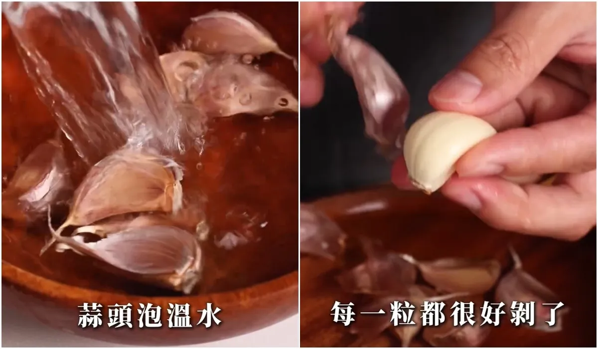 主婦們從市場上買蒜頭回家最常用的方法,就是將蒜頭放進溫水中,浸泡約半小時,就能輕鬆褪去蒜頭膜,取出完整的蒜仁了。