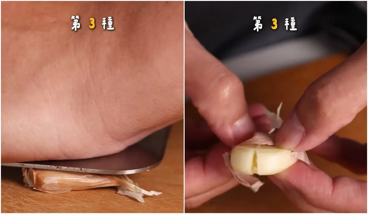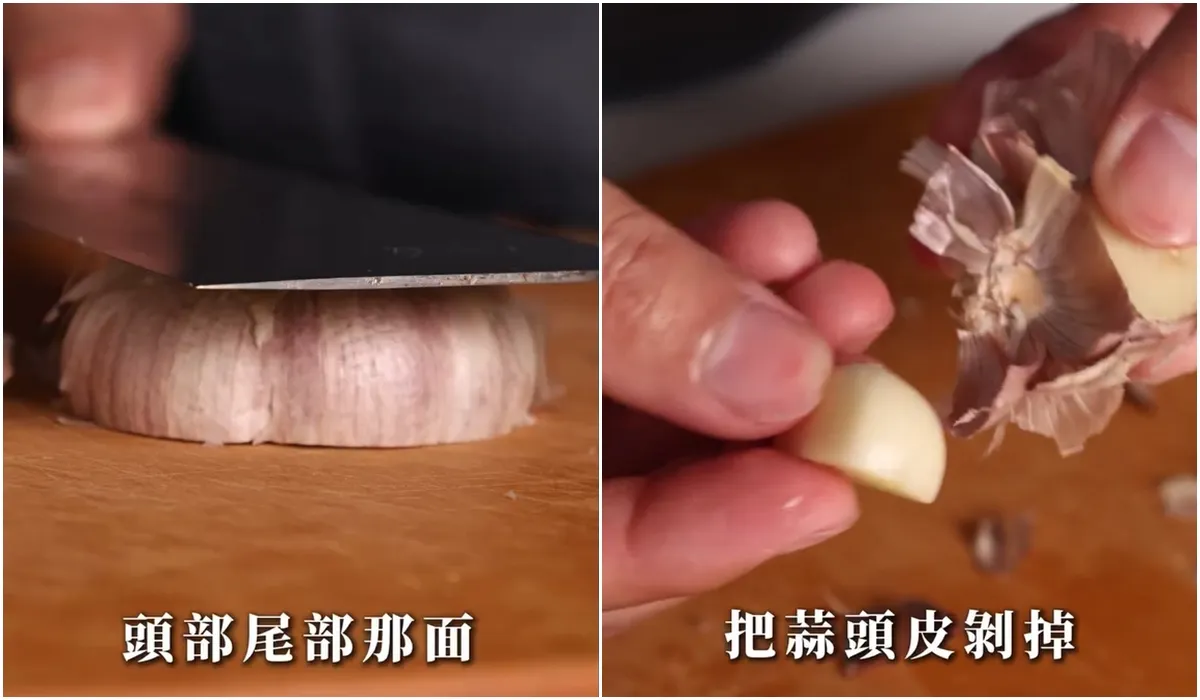 用碗底或刀背略微施力壓開蒜皮,就能取出蒜仁。不過,阿慶師提醒,壓過的蒜頭不是完整的蒜仁,適合立即料理,不適合再久放。