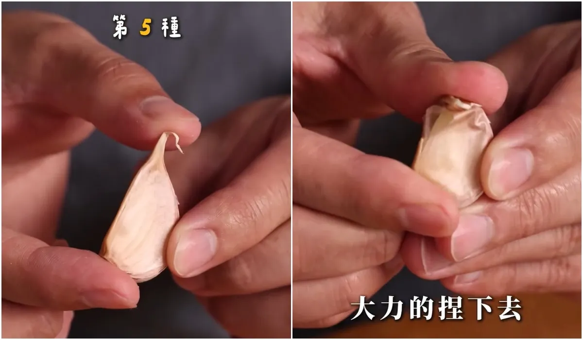 這招「2指功」,只要將蒜粒以拇指和食指,對著蒜頭的頭尾用力捏下去,是最快速取蒜仁的方法。