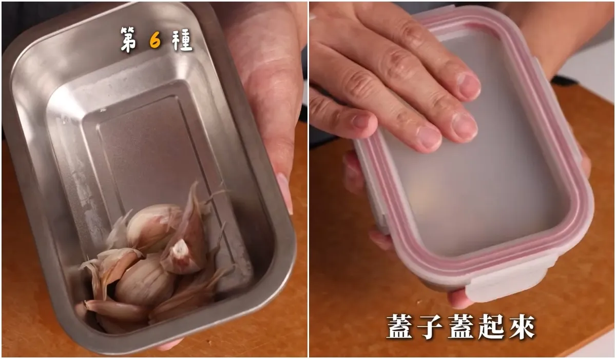 將蒜頭放進保鮮盒,蓋上盒蓋,輕輕搖晃約20至30秒,打開盒蓋就能看蒜皮、蒜仁自動分離了。