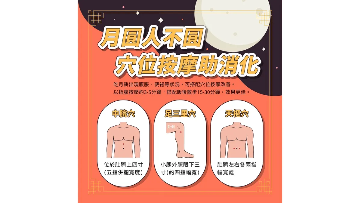 劉宇真提醒,除了茶飲,也可透過簡單的穴位按摩,幫助改善飯後腹脹、便祕等消化問題,民眾可按摩以下3個穴位,每次以指腹按壓約3至5分鐘,再搭配飯後散步15至30分鐘,效果更佳。