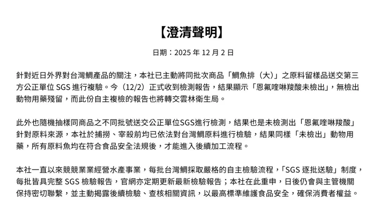 「口湖漁類生產合作社」聲明表示,針對近日外界對台灣鯛產品的關注,已主動將同批次商品「鯛魚排(大)」之原料留樣品送交第三方公正單位SGS進行複驗,12/2正式收到檢測報告,結果顯示「恩氟喹啉羧酸未檢出」。