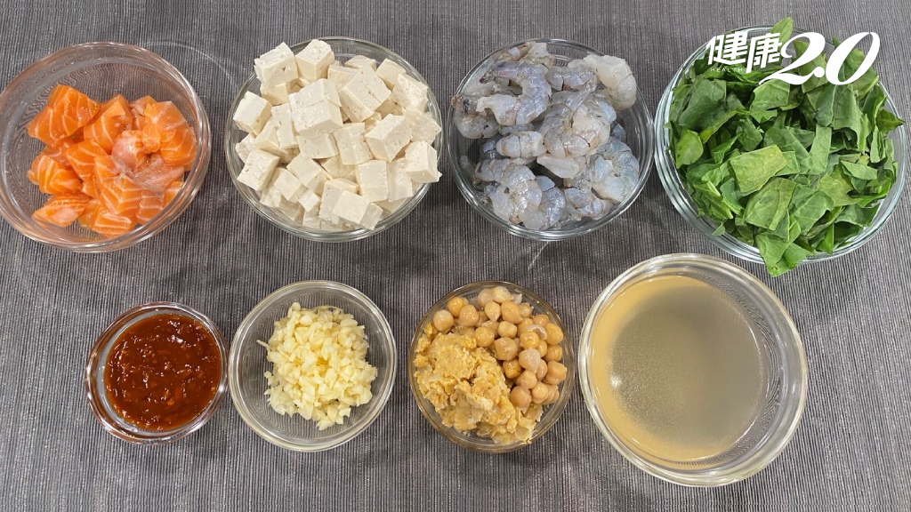 陳之穎表示,鮭魚是地中海飲食常用的食材,用來代替麻婆豆腐原來的絞肉,因為鮭魚也帶有油脂,炒起來也會像絞肉的感覺。此外,大部分麻婆豆腐會勾芡,這次用鷹嘴豆泥代替,豆泥會讓整體口感吃起來比較濃稠、有勾芡的感覺,還能補充纖維、增加飽足感,鷹嘴豆也被視為超級食物之一。蝦子切丁拌炒,整體口感也會較一致。
