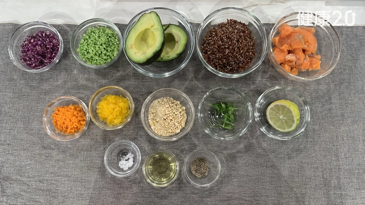 鮭魚清肉150克、酪梨2顆、檸檬汁10毫升、熟紅藜麥30克、紅蘿蔔末50克、黃椒末50克、毛豆碎50克、堅果碎50克、紫高麗菜末50克、鹽巴5克、黑胡椒3克。