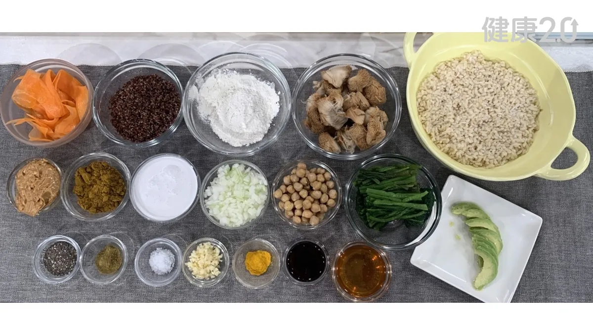 猴頭菇塊200g、熟藜麥100g、熟糙米200g、熟菠菜50g、熟鷹嘴豆30g、奇亞籽10g、醃紅蘿蔔片20g、酪梨片30g、麵粉少許、洋蔥末100g、蒜末20g、椰奶100毫升、醬油30毫升、咖哩粉15g、薑黃粉5g、孜然粉3g、蜂蜜30g、顆粒花生醬50g、鹽。