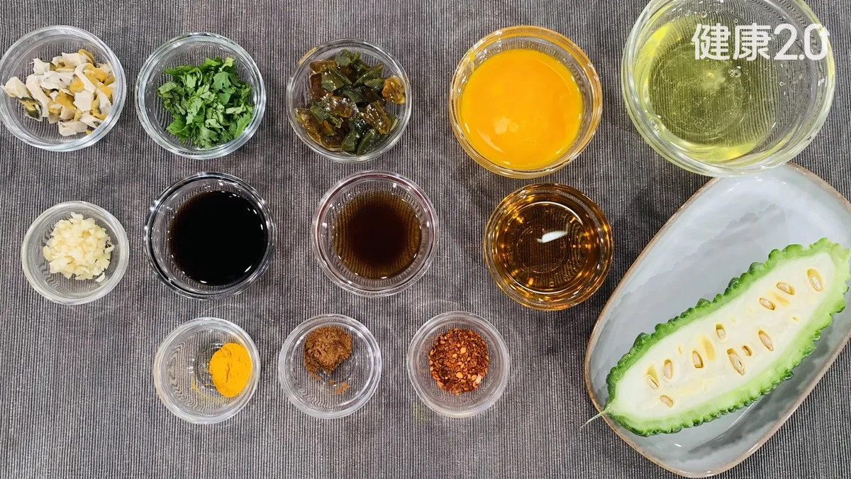 苦瓜1條、蛋清6顆、蛋黃6顆、皮蛋1顆、鹹蛋黃2顆、辣椒片5克、薑黃粉3克、肉桂粉3克、蒜末15克、香菜5克、烏醋15c.c.、醬油15.c.c.、香油30c.c.。