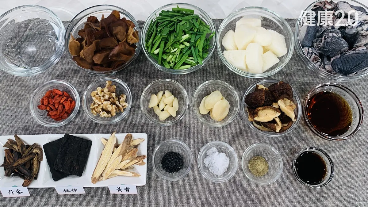 烏骨雞、黃耆、杜仲、丹參、黑芝麻油、薑片、蒜頭、乾香菇、山藥、胡椒、鹽、米酒、黑木耳、核桃、枸杞、韭菜。