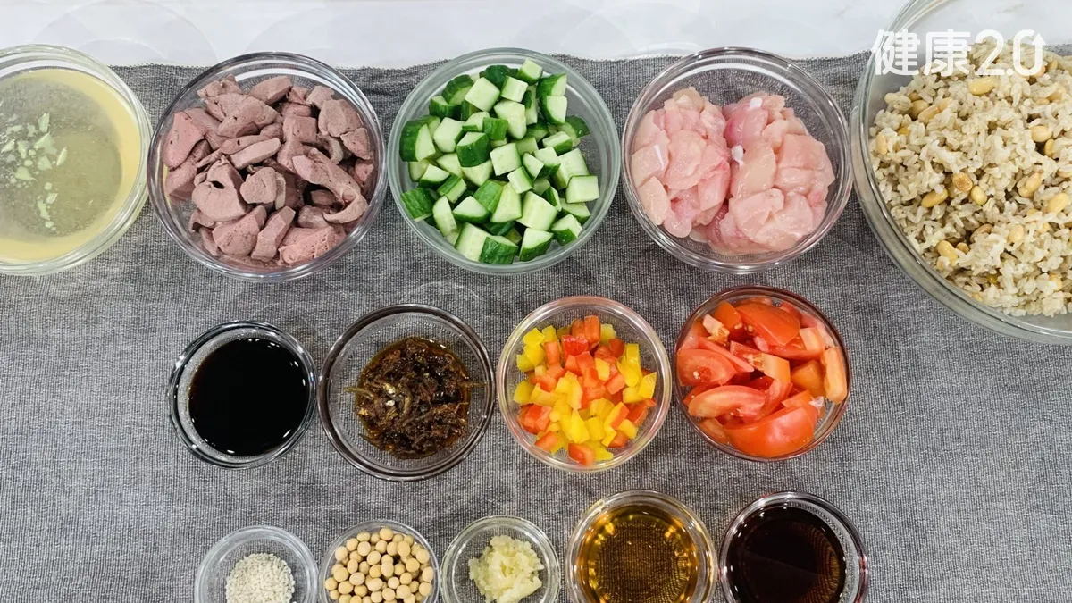 胚芽糙米、黃豆、白芝麻油、黑芝麻油、蒜泥、XO醬、雞里肌肉、番茄、紅黃甜椒、醬油、小黃瓜、豬肝。