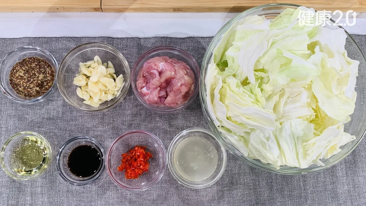 高麗菜、雞絞肉、法式芥末子醬、醬油、辣椒、檸檬、蒜頭碎。