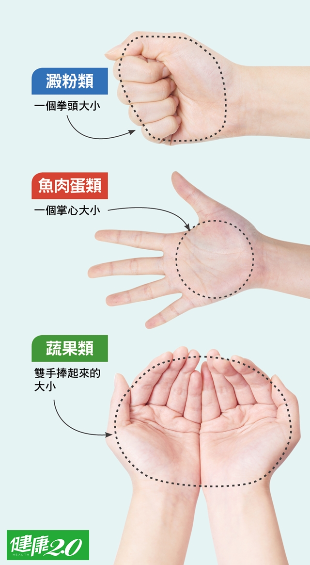 基本上,每一餐的攝取量是:肉類約掌心大小(不包括手指),澱粉類是拳頭大小(約莫1小碗),而青菜則是2個手掌合捧起來量,大原則是總分量不超過2隻手相連接的大小。