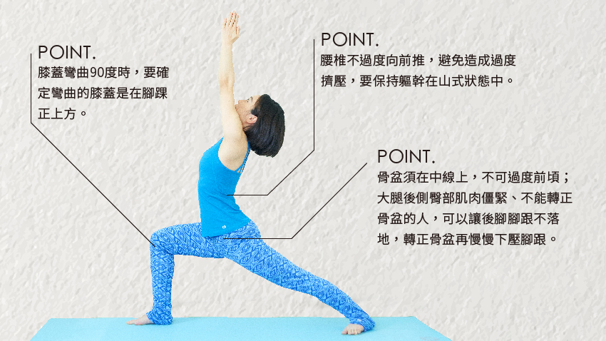 ❷吐氣,身體緩慢下壓,右膝蓋彎曲90度,右大腿與地面平行,右小腿與地面垂直,彎曲的膝蓋不能超過腳踝。左腿向外伸直,膝蓋上提。臉部、胸部、右膝與右腳朝同一方向,頭部向上延伸,從尾骨開始延展脊椎。眼睛專注於合十的雙掌,停留約20至30秒、5至6個正常呼吸。換邊進行。