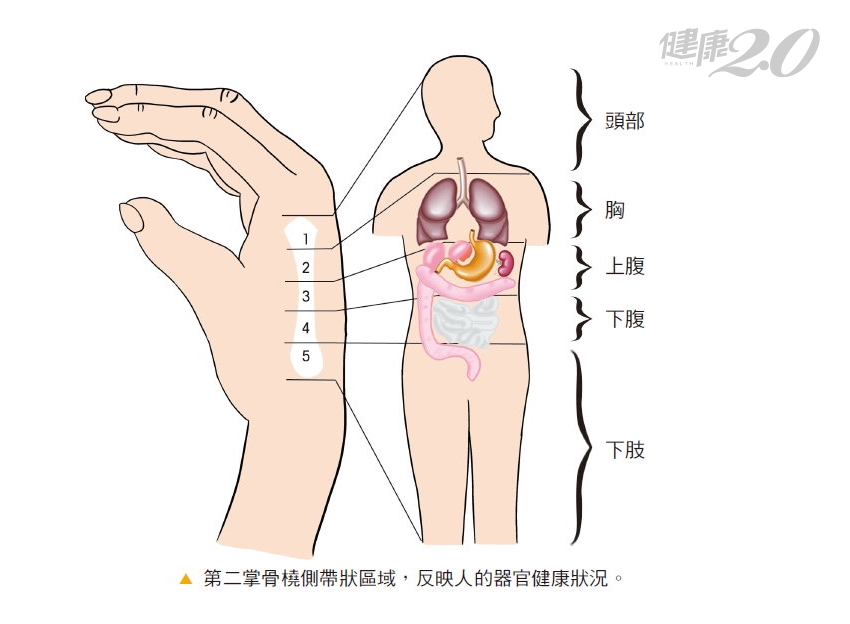 手是站立的「人」,將手掌立起,指尖處為眼,延手指向下依次反映口腔、鼻腔、喉頭、氣管等器官的健康狀況;掌心部位聚集著對應心、肝、肺、脾、腎等五臟的穴位;繼續向下直到接近掌根部,則反映生殖器的情況。