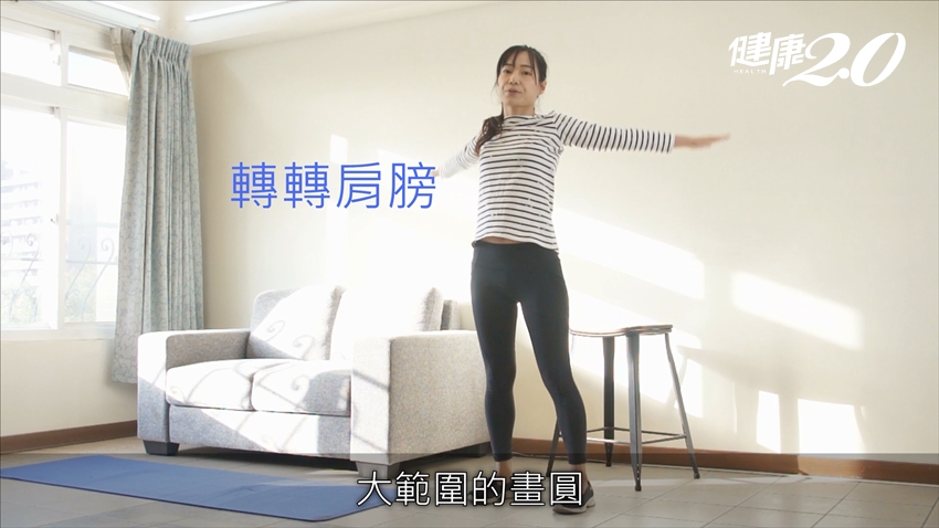 雙手向兩側伸直,大範圍畫圓,順時鐘或逆時鐘皆可,畫10個圓之後再反方向重複一次。如果覺得肩膀轉動時有吸不舒服,可以將手肘微微彎曲,畫圈幅度視個人狀況調整。