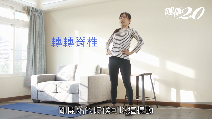 轉動腰部,水平方向慢慢畫圈;如果覺得畫圈圈比較困難,也可以改為左右擺動上半身。