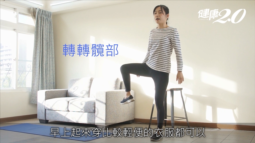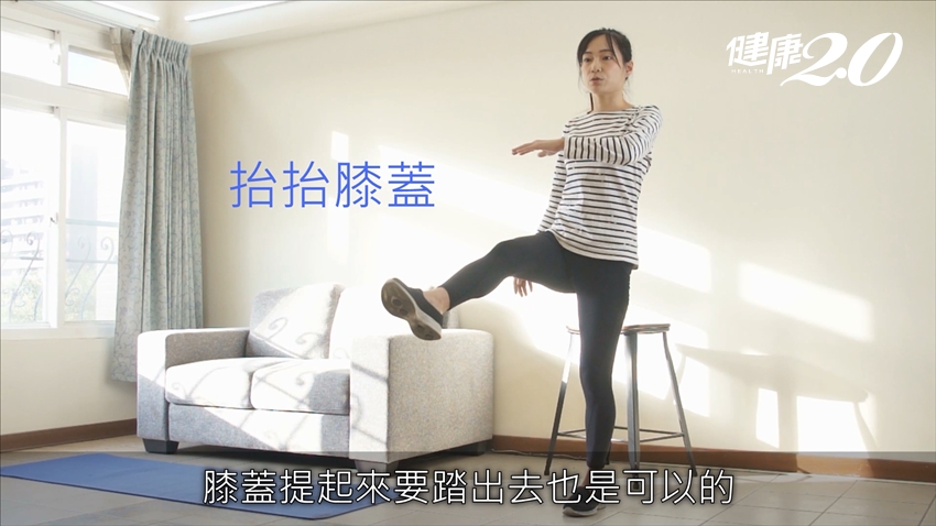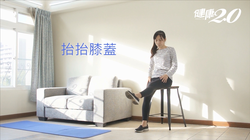 假如膝蓋不太舒服,無法順利做出以上動作,也可以改成坐在椅子上,分散體重,讓膝蓋不需要承受過多重量,再進行抬膝動作。