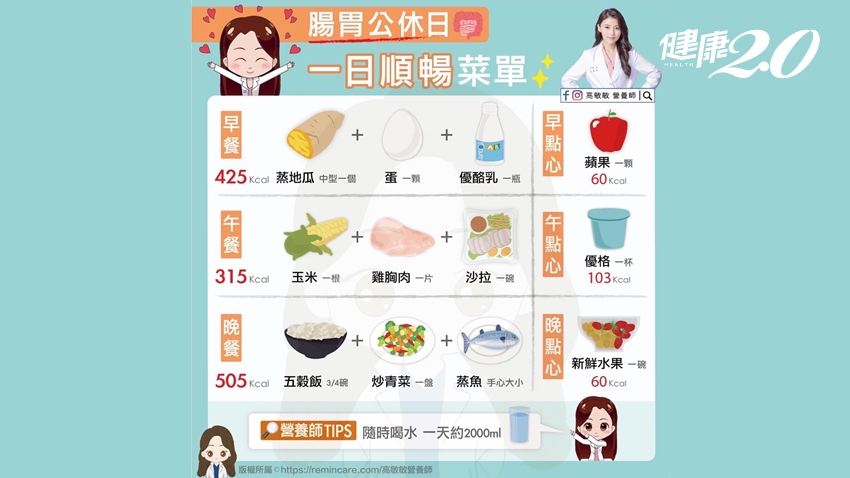 所謂「腸胃公休日」,高敏敏建議可以採「吃六休一」的方式,一周選一天當作腸道的公休日!透過原型高纖的食材搭配含好菌的優酪乳,取代高油高鹽高糖的飲食,減輕腸道負擔,來個體內順暢大掃除!以下是她推薦的「一日順暢菜單」,趕快來吃吧。