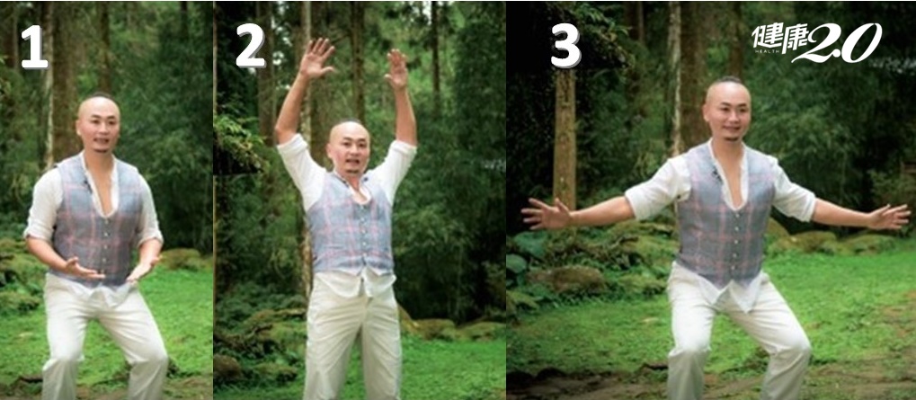 1.兩腳與肩同寬,兩手以顫掌方式,從身體內側向外畫大圓。
