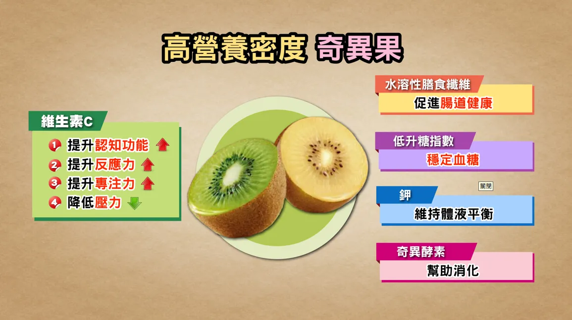 「早餐更是攝取水果的黃金時機!」宋明樺指出,早餐加入水果除了提升飽足感與幫助腸道健康,且有助於專注力為學習加分,國際研究也證明,血漿中的維生素C濃度,越高認知表現越好,而奇異果特別適合空腹時食用,因為富含維生素C,能夠與其他營養素像是鈣與鐵產生協同作用,讓1加1大於2,這些原本比較不容易吸收的營養素,在體內吸收率變得更高,不只幫助大腦更清醒、提升專注力,也能強化抗壓能力,讓孩子在學習時表現更穩定,也讓大人面對工作壓力時有更好的精神狀態。