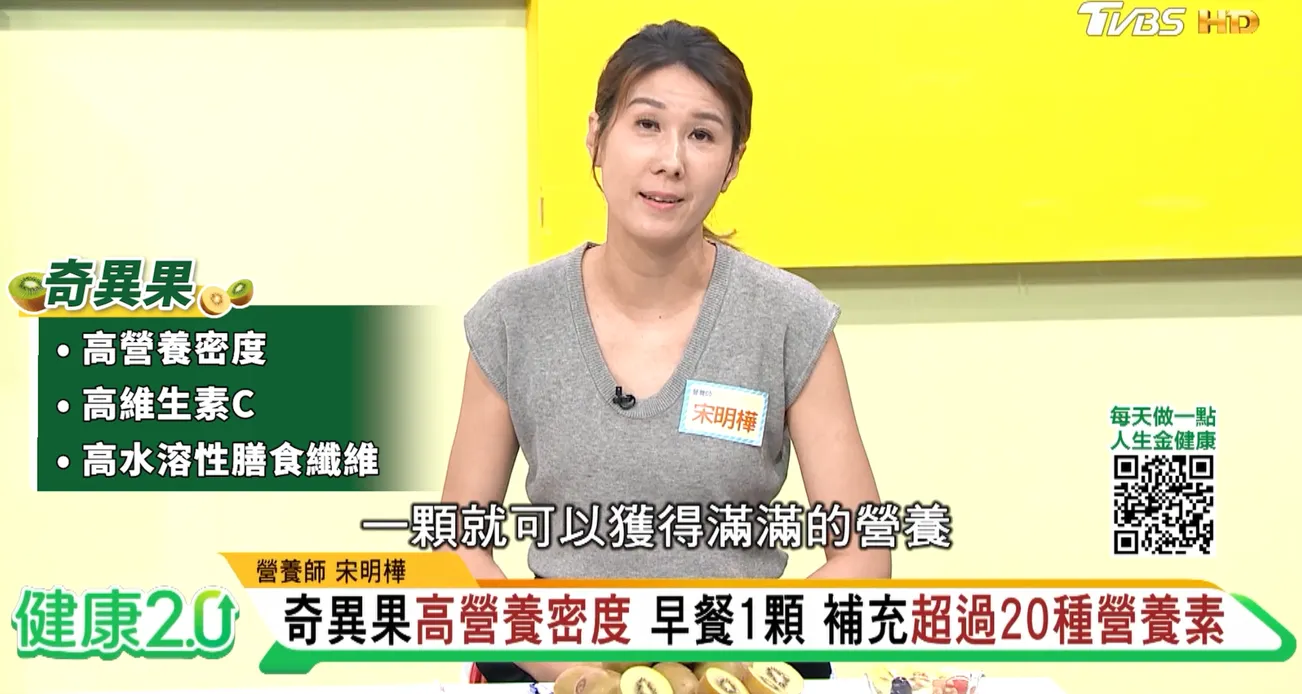 作為營養師,宋明樺經常被問到「早餐要怎麼吃才是最營養健康?」她認為,早餐要吃得好並不難,只要能兼顧全穀雜糧類的主食、優質蛋白質食物,再加上一份新鮮水果,整體營養就能達到平衡,在水果的選擇上特別推薦奇異果,除了好準備、好攜帶、好攝食;更重要的是,奇異果屬於高營養密度的水果,意思是在同樣的熱量下,提供更豐富的營養素,含有大量的維生素C、水溶性膳食纖維、鉀、葉酸及多種抗氧化物等,光是一顆就能補足超過20種營養素。
