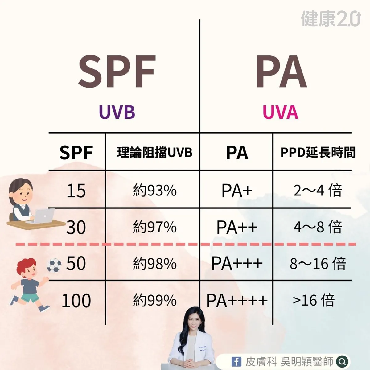 吳明穎建議,如果較長時間待在室內,SPF係數選30就足夠,如果要長時間在戶外活動,建議選擇SPF50才有足夠的防護力,並且記得每2小時就要補擦1次,如果有流汗、游泳,就要立即補擦,不用等2小時。