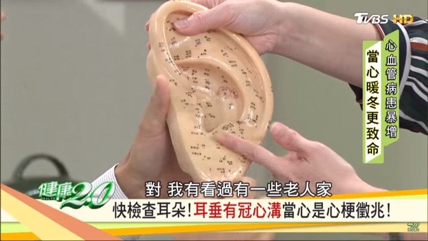 陳裕峰也提到,耳垂上出現一道摺痕,稱為「冠心溝」,也可視為心血管疾病的一個表徵,根據國外多個研究均發現,耳垂出現橫紋的人,有6成跟心血管疾病有關,橫紋的出現代表末稍血液循環不好,久而久之就出現了一道摺痕。