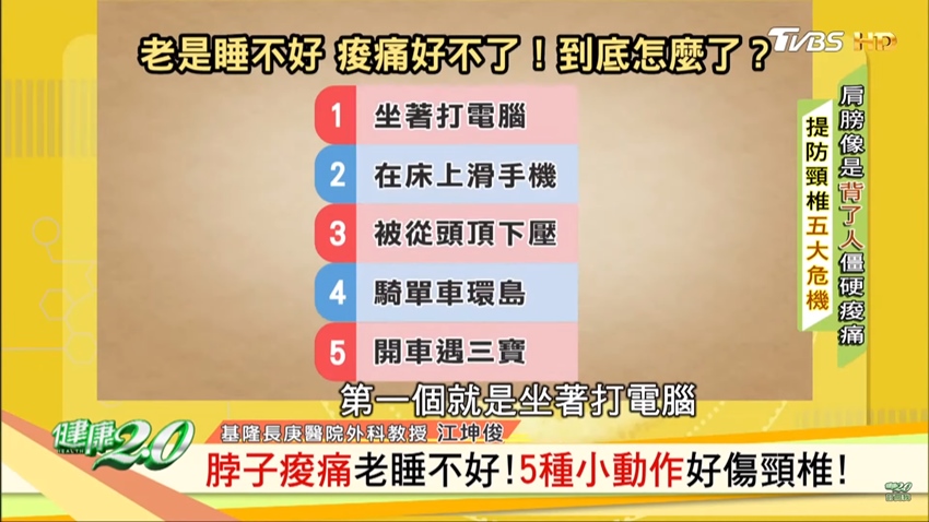 江坤俊說,很多人睡前,常常坐在床上低著頭滑手機,或是一隻手撐著頭,另一手滑手機。光是這2個小動作都讓頸椎承受了莫大的壓力,長期下來脖子自然會痠痛。