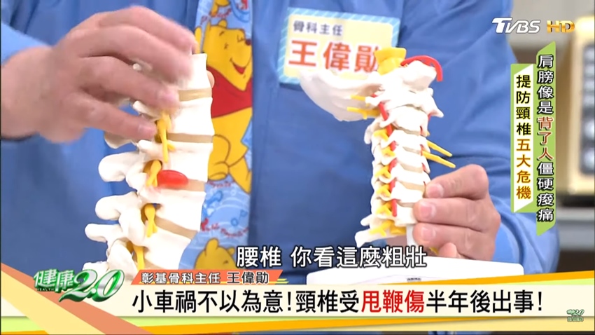彰化基督教醫院骨科主任王偉勛指出,在車禍的過程中,不管是撞到別人或被別人撞,頭部就像是鞭子最容易甩動,先往一個方向甩動,再彈回反方向,造成頸部的疼痛。比較嚴重情況是後面的韌帶受傷,更嚴重可能頸椎往前裂,傷到脊髓或是椎間盤,出現「甩鞭症」。