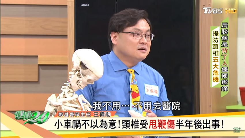 他常在門診碰到這類因車禍造成傷痛的病人,問他們為何當下不去急診,患者告訴他,「因為當心不會痛。」其實頸椎在前後甩動時已造成局部組織發炎,等到感到時常常是第二天、第三天以後,因此發生車禍時,不要急著向警察說「我不用上醫院」。