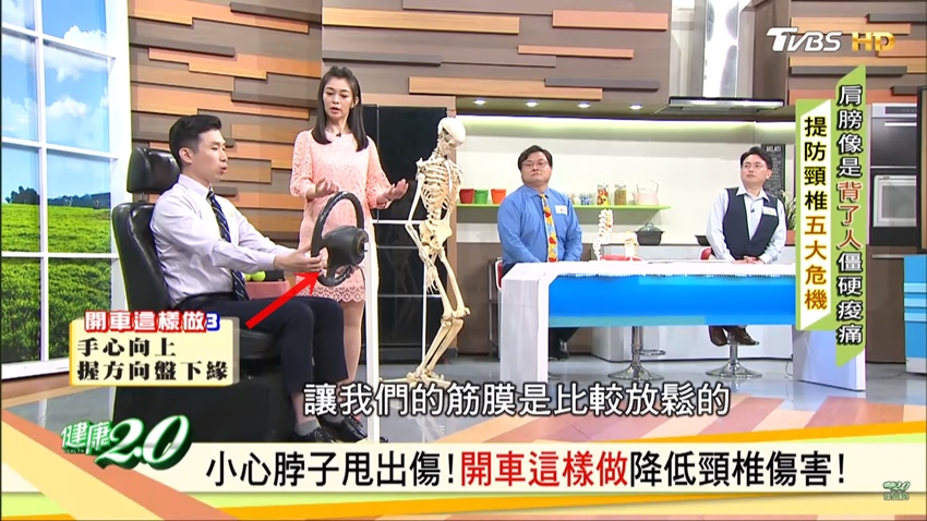 一般我們都習慣的姿勢,手掌心向下握著方向盤兩邊,但這樣的姿勢,長時間下來容易造成手臂前側肌肉緊繃、出現圓肩,造成頸椎壓力。建議可以適時變換姿勢,把手心向上下,這樣會有自然擴胸的效果,讓筋膜、肌肉與頸椎比較放鬆。