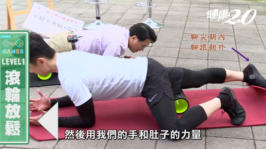 身體採跪姿,右腿放鬆靠在滾筒上,手肘靠在地板上呈低平板式,大腿外側按壓滾筒,腳尖朝內、腳跟向外,用手肘及腹部核心力量來回推;大腿也可隨意向「右、左」偏,感覺到肌肉有被按摩到,就對了。
