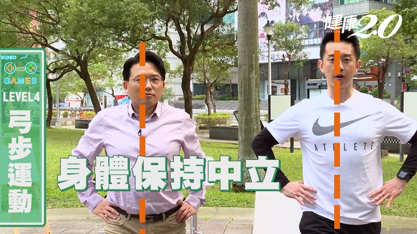 雙腳打開與肩同寬、手叉腰,右腳往前左腳往後,左腳尖踩地且腳跟離地。背部要打直,身體保持中立,先吸一口氣,吐氣時慢慢往下蹲。右膝蓋彎曲,膝蓋對齊腳尖,盡量不要超過腳尖;停留一下,吸氣再慢慢站起來。記住,後腳的腳跟要離地。做4次後,換邊。